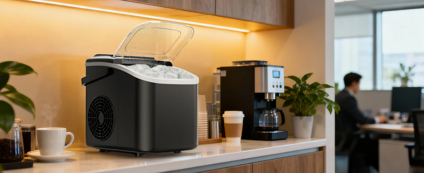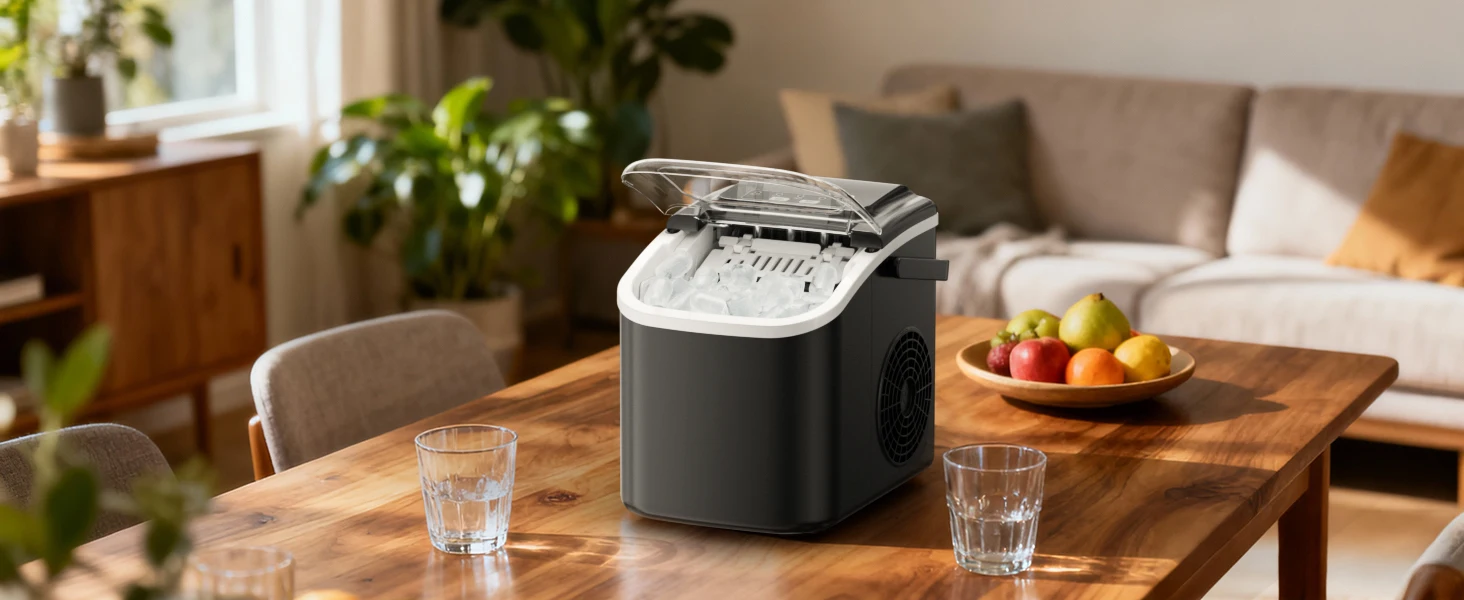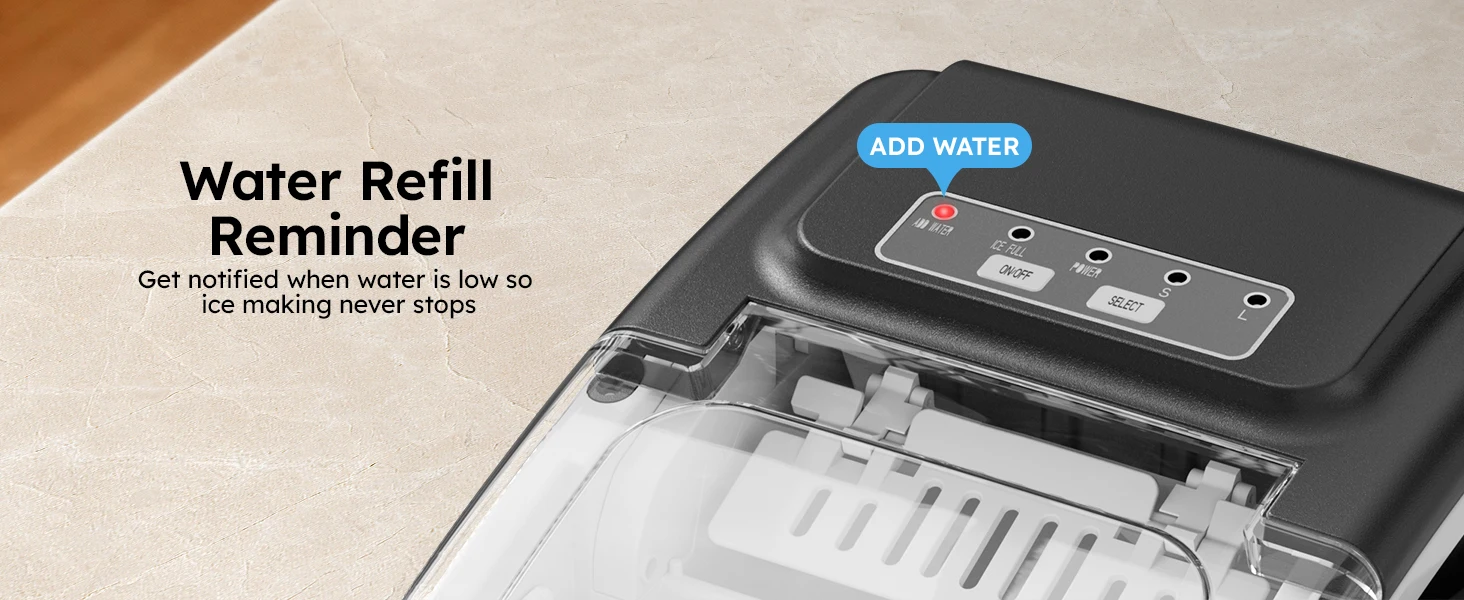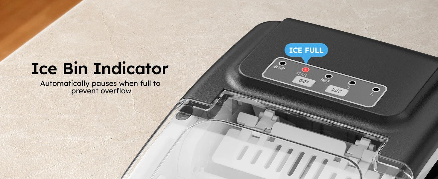 🤫 Smart Operation & Quiet Efficiency User-friendly indicator lights alert you when the ice is full or water is low. It operates quietly at under 40dB, ensuring it never disturbs your peace.