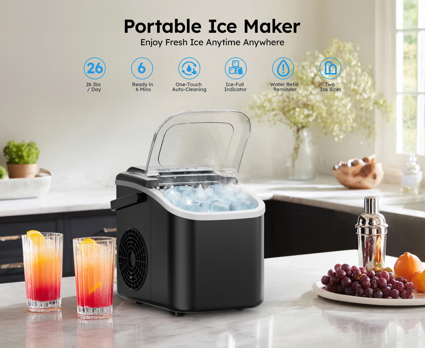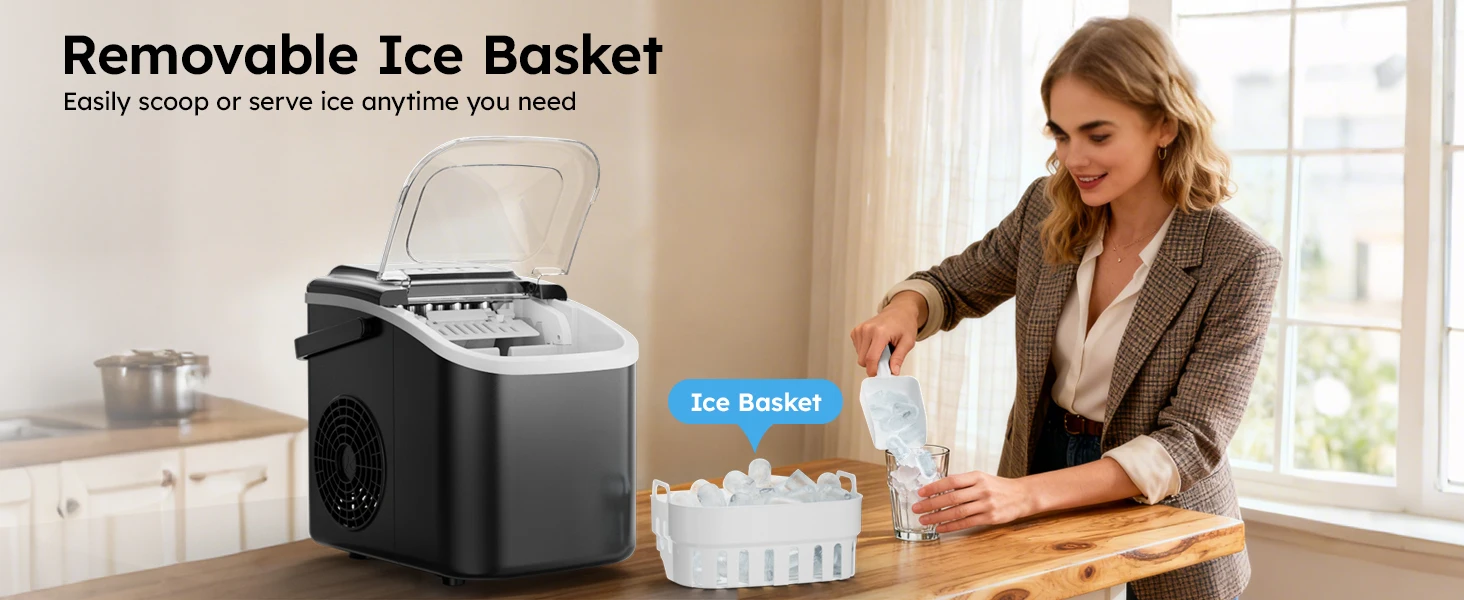 This portable countertop ice maker is the ultimate solution for fresh ice anywhere, anytime. It quickly produces up to 26 lbs of chewable bullet ice in 24 hours, with your first batch ready in just 6 minutes. Featuring a compact design with a carrying handle, it's perfect for your kitchen, RV, or camping trips. With two ice sizes, a self-cleaning function, and intuitive indicator lights, it combines convenience, speed, and reliability in one sleek package.